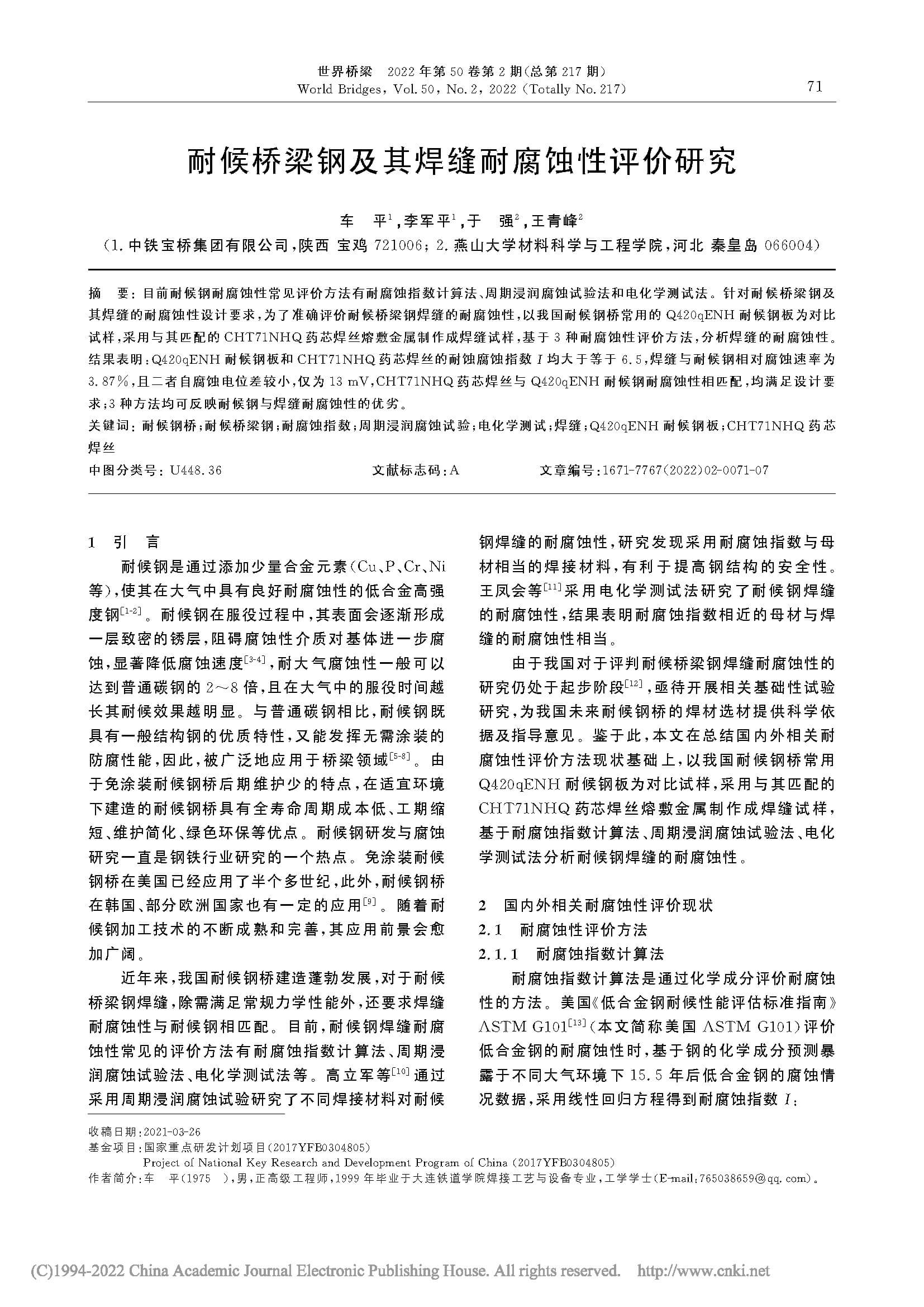 标签: 耐候钢桥, 耐候桥梁钢, 耐腐蚀指数, 周期浸润腐蚀试验, 电化学测试, 焊缝, Q420qENH 耐候钢板, CHT71NHQ药芯焊丝