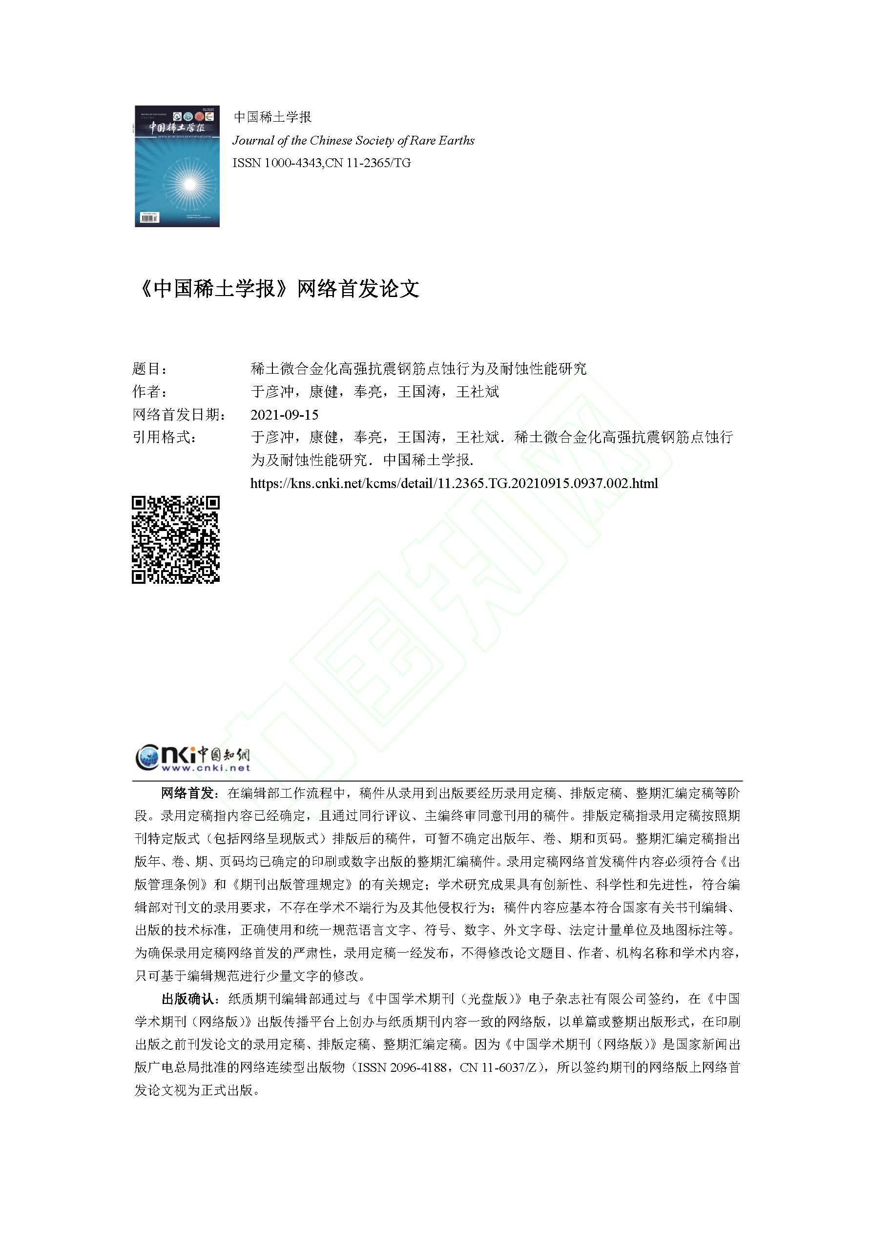 稀土微合金化高强抗震钢筋点蚀行为及耐蚀性能研究