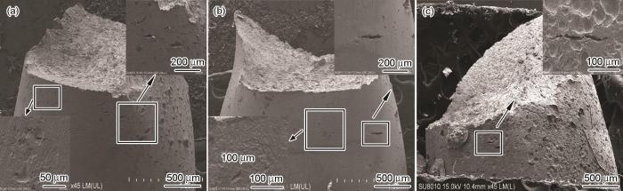 为了更好观察疲劳裂纹起源,对疲劳断口侧面进行观察。图11为X65钢在空气中疲劳断口的侧面形貌所示。由图可知,在空气中三种波形下断口颈缩现象明显,断口附近未发现二次裂纹,只有一条主裂纹。对试样在海水中腐蚀疲劳断裂后侧断口进行观察,其形貌如图12所示。由图可知,海水中三种加载波形下裂纹均萌生于点蚀。三种加载波形下在裂纹源附近都存在二次裂纹,其中正弦波下试样表面点蚀坑最少,二次裂纹较多,表明其腐蚀疲劳断裂敏感性最高;正锯齿波下试样表面的点蚀坑数量最多,尺寸最大,腐蚀最严重,二次裂纹较少,表明其阳极溶解程度最大。