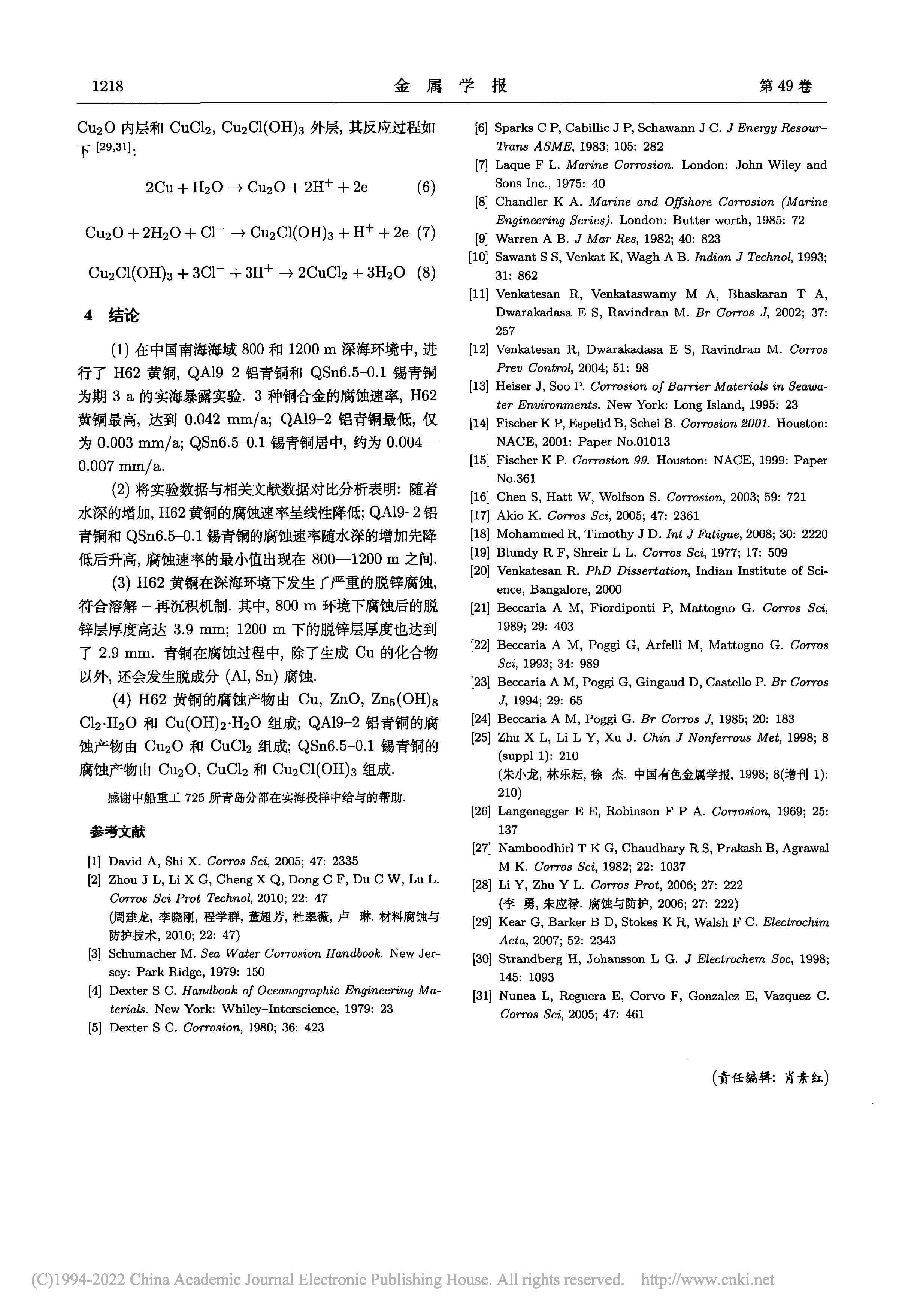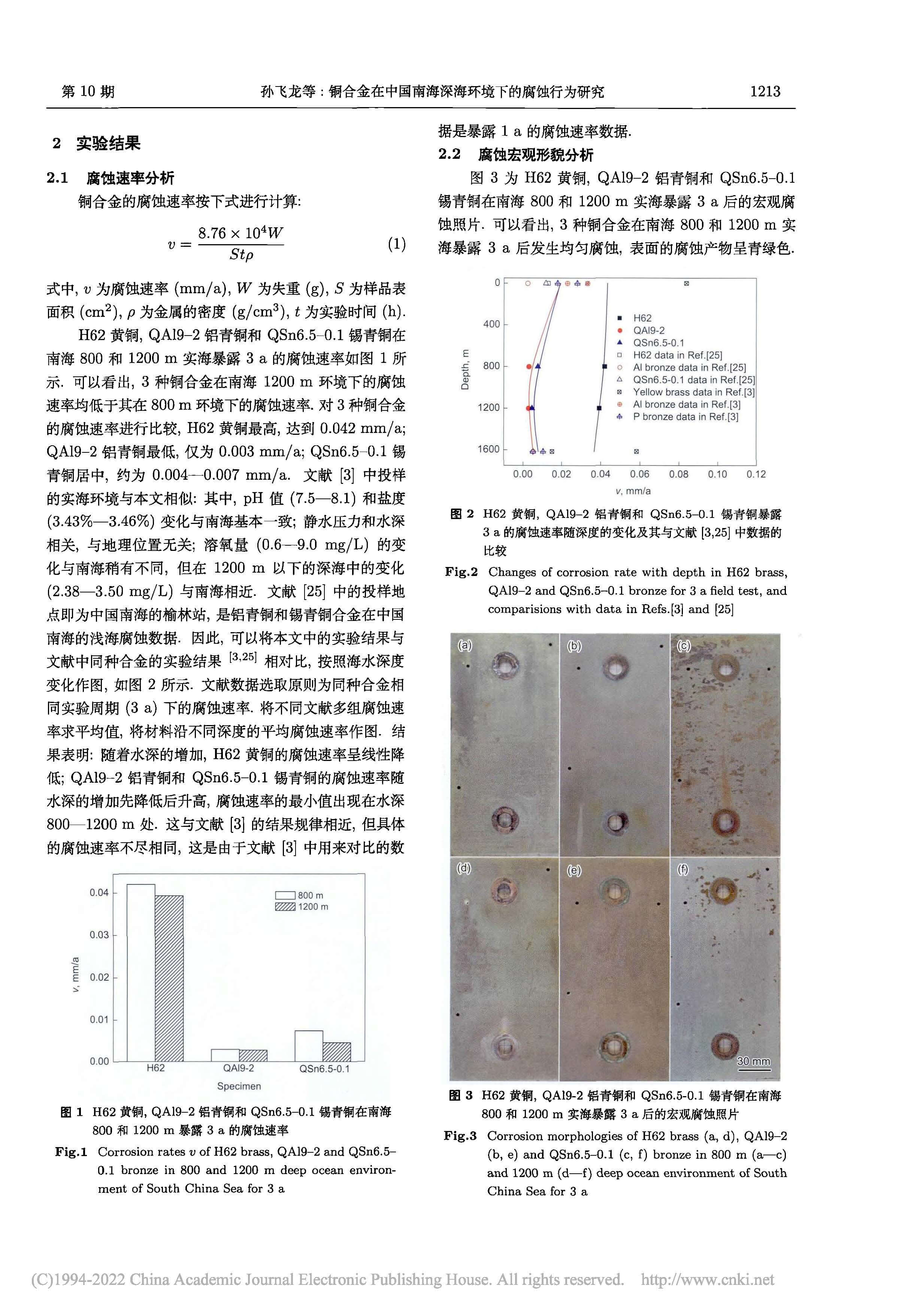 铜合金在中国南海深海环境下的腐蚀行为研究