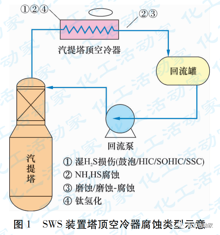 该SWS装置空冷器材料为316LSS,因此不存在钛氢化腐蚀,主要腐蚀应是湿H2S损伤和NH4HS腐蚀,及一定的化学腐蚀和冲刷腐蚀。
