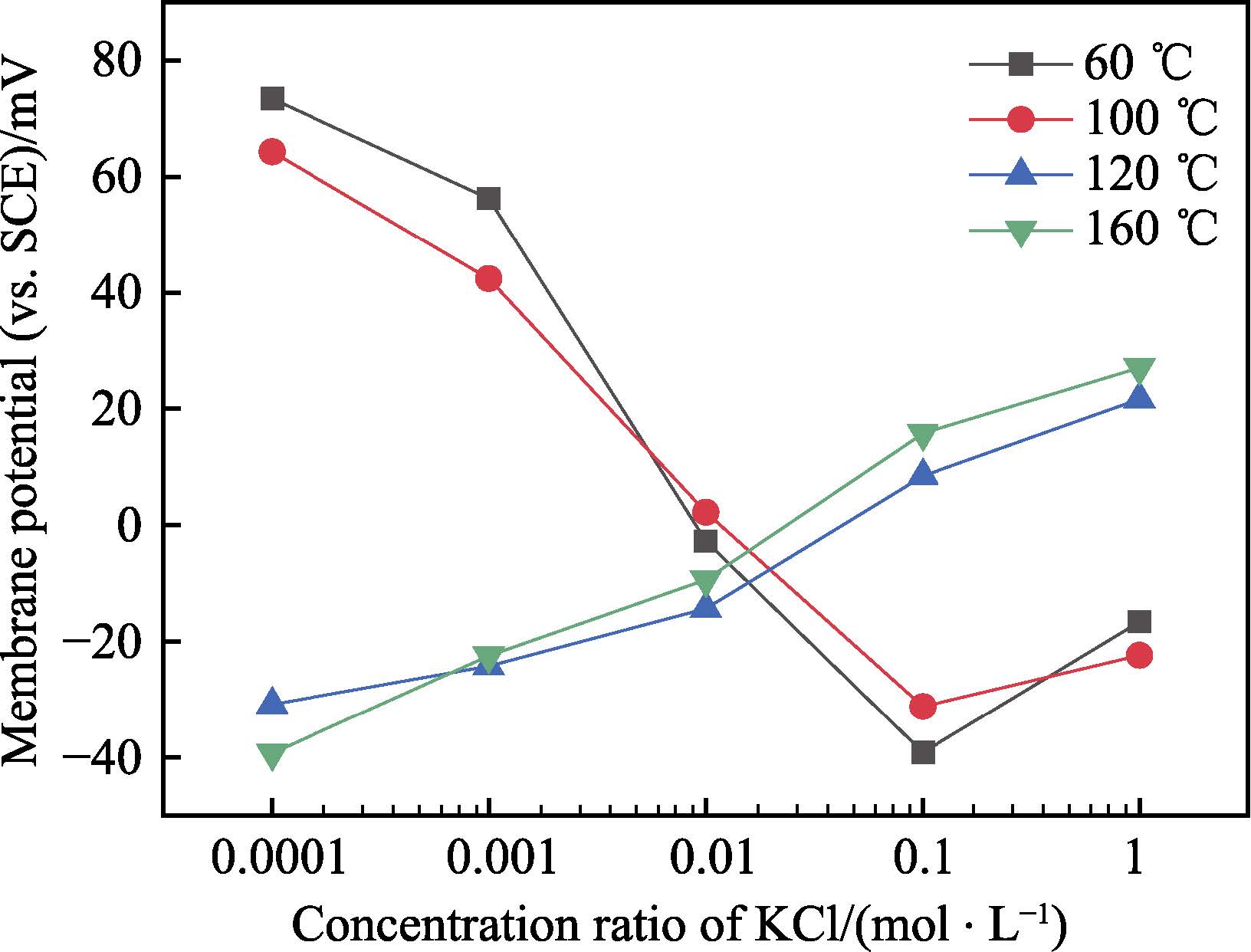 腐蚀产物通常具有离子选择性,将影响溶液和基体金属表面之间的离子传输,进而影响金属基体的腐蚀过程。膜电位试验是表征腐蚀产物离子选择性最常用的实验方法。图8 为60、100、120、160 ℃下腐蚀产物的膜电位随KCl 浓度变化的曲线,结果表明,形成于60 ℃和100 ℃的腐蚀产物的曲线斜率为负,而形成于120 ℃和160 ℃的腐蚀产物的曲线斜率为正。曲线斜率为正表示腐蚀产物具有阴离子选择性,而曲线斜率为负表示腐蚀产物具有阳离子选择性。值得注意的是,腐蚀速率在100 ℃和120 ℃之间出现了拐点,而与之同时腐蚀产物的离子选择性也发生了转变,由马基诺矿转变为磁黄铁矿膜电位的结果表明。膜电位和XRD 的实验结果表明,形成于较低温度的马基诺矿具有阳离子选择性,而形成于较高温度的磁黄铁矿具有阴离子选择性。