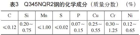 试验材料为板厚2.5mm的Q310NQL2钢及板厚3mm的Q345NQR2钢,对试验材料表面进行喷砂处理后进行电阻点焊试验。试验材料的化学成分及力学性能分别见表1~表4。