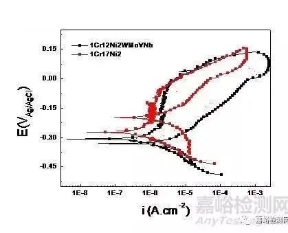 在评价工程材料的耐蚀能力时,有这样一种非常困扰的现象是经常遇到的,如图11所示。1Cr17Ni2不锈钢的击破电位低于1Cr12Ni2WMoVNb不锈钢,但是1Cr12Ni2WMoVNb不锈钢的维钝电流却高于1Cr17Ni2不锈钢。根据上面介绍的评价标准,很难判断哪种材料的耐蚀性能更好。