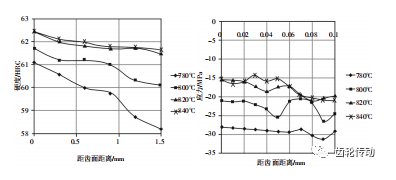 在齿面上随机选择若干组点,取其硬度的平均值作为研究对象。图 1 显示了不同淬火温度下齿轮硬度沿齿厚方向的变化情况。随着淬火温度的升高,齿轮的硬度不断增加,在 820℃时表面硬度达到了最大值 HRC 62.1,随后齿面硬度变化趋于平稳。原因在于,随着淬火温度的升高,材料内部合金元素的碳化物逐渐溶解,碳在奥氏体中的均匀度也慢慢提高。淬火后,马氏体中碳的饱和度也不断增大,因此随着淬火温度的不断升高齿轮的硬度不断增大,此后随着马氏体中碳的逐渐饱和,齿面硬度的变化也趋于平缓。