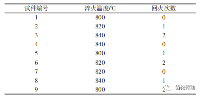 试验方案与设备:从淬火温度对齿面硬度、回火次数对材料金相组织的影响规律出发,建立热处理优化方案的验证试验。结合仿真分析与生产经验,设置3个淬火温度,分别为800℃、820℃和840℃,回火次数设置为 0、1、2次,其余热处理工艺参数维持不变,试验方案, 如表2所示。
