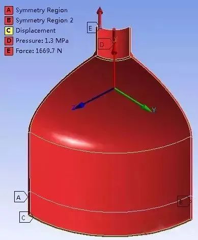 设置A、B平面为对称面,限制筒体C面X向位移,在内壁面施加压力1.3MPa,在接管端面施加等效接管力,如图6所示。