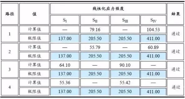 根据分析得到的应力分布云图以及自身结构特点,在模型上选取4条路径,如图8所示。具体评定数据如下表所示。线性化路径选取原则为: