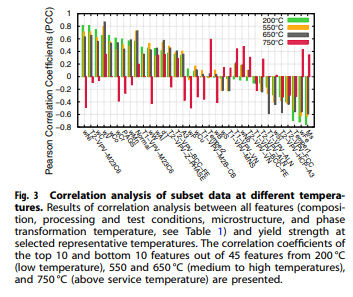 图3.不同温度下子集数据的相关性分析。所有特征(组成,加工和测试条件,微观结构和相变温度,请参见表1)与选定代表温度下的屈服强度之间的相关性分析结果。给出了200°C(低温),550°C和650°C(中至高温)以及750°C(高于使用温度)的45个特征中前10个和后10个特征的相关系数。