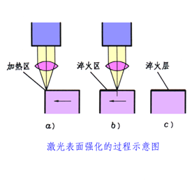 激光表面强化是用聚焦的激光束射向钢件表面,在极短时间内将工件表层极薄的材料加热到相变温度或熔点以上的温度,又在极短时间内冷却使工件表面淬硬强化。激光表面强化可分为激光相变强化处理、激光表面合金化处理和激光熔覆处理等。