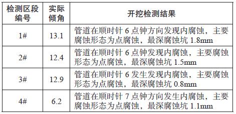 从以上开挖检测数据可以看出利用管道内腐蚀外检测技术对管道内腐蚀缺陷的检出率非常高,也易判断管道内腐蚀严重程度。由于输气管道的管道内腐蚀主要是由积液或者杂散堆积造成的,腐蚀位置主要发生在管道底部,腐蚀形态为局部点腐,腐蚀速度相对较慢。