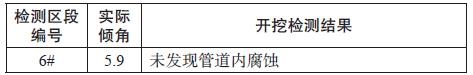 根据图5 分析可知,顺气流方向有1~3# 点的实际倾角大于临界倾角,此外根据地势选择4# 穿越铁路段进行开挖验证,下游方向选择最大倾角6# 开挖验证,每一处开挖点开挖范围约3m*2m,如图6 所示对开挖处的管道进行超声波检测,发现管道内腐蚀的位置和判断其腐蚀严重程度,验证结果如表1。