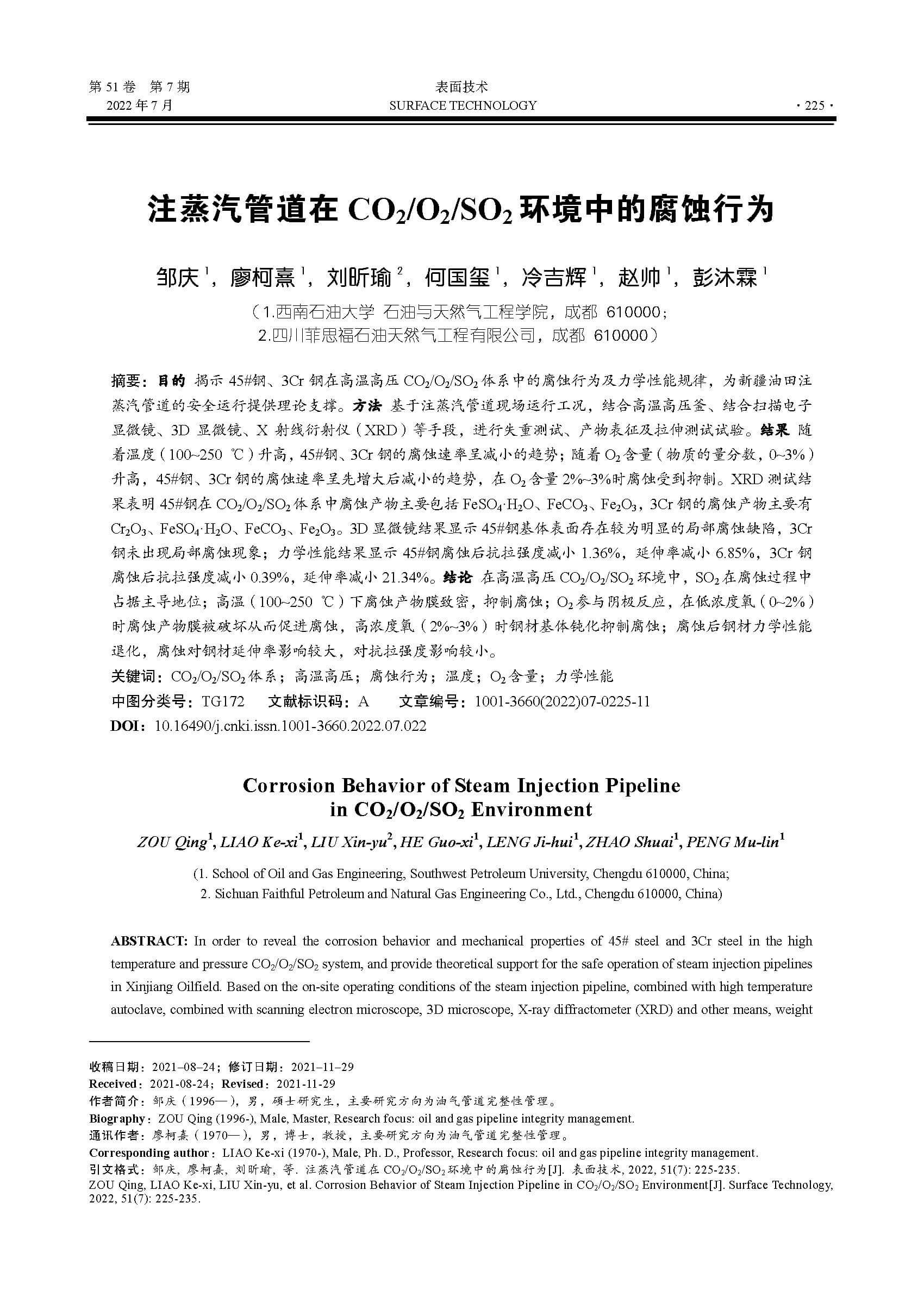 注蒸汽管道在CO2/O2/SO2 环境中的腐蚀行为