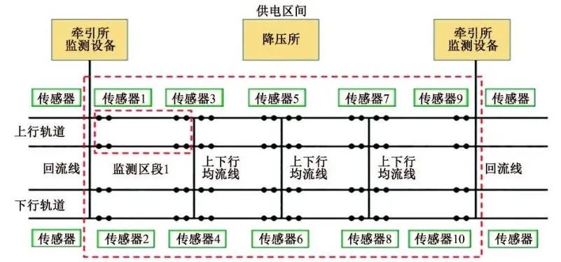 针对以上局限性,国内厂家和相关学者对其进行了优化设计,以回流电缆和均流线为界,将一个供电区间划分为若干个监测区段,在分界点设置智能传感器,每个传感器与轨道之间设置8个连接点,包括6路输入信号、1个主体结构钢筋和1个参比电极的连接点,两个传感器之间构成一个监测区段,如图3所示。利用两个传感器的监测数据计算区段内的平均泄漏电流,进而得到区段轨道的平均对地过渡电阻,测试原理如图4所示。