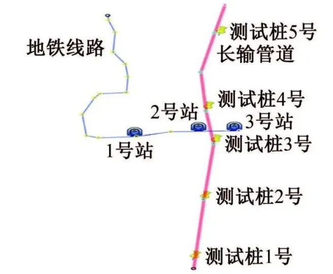 图6 管道各监测点与地铁牵引站的相对位置示意