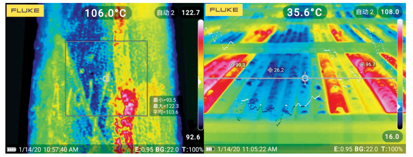 在石化行业,由于生产需要,许多设备管线是在高温条件下运行的,当出现保温脱落、腐蚀减薄等情况,表面热分布会出现异常。通过对温度分布的分析,可以监测反应器、加热炉、管线、散热器等设备运行状况,评价衬里损伤和保温效果,预测设备的运转情况,同时可以指导检修,增加检测的预知度。如图是工作人员使用福禄克Ti300便携式热像仪拍在炼厂拍摄的管线和空冷管的热成像图,可以看到局部区域温度异常(显示为红色),可能发生了腐蚀减薄。