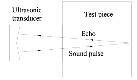 目前比较广泛使用的一般是脉冲式超声波测厚仪,频率一般在1~5 MHz。其原理是将在压电晶体制作的探头上施加电脉冲信号,使其发生强烈的振动产生超声波。超声波经过延迟块和耦合剂到达被测试件表面,部分反射回接受晶片;剩余部分超声波在工件内遇到缺陷或分界面时反射回来。通过两次反射波的时间差与声速计算即可得到工件厚度。由于超声波在不同材料中的传播速度不同,在对不同材料进行测厚时,需要分别校准声速。