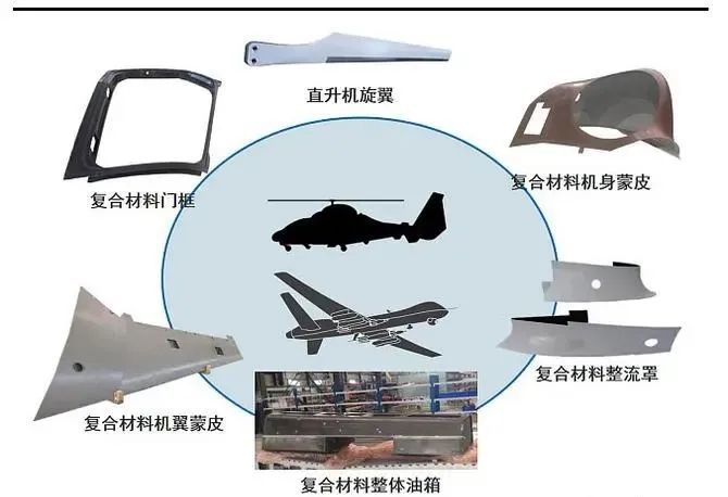 在新一代军机上,复合材料主要应用在机翼、鸭翼、尾翼、垂尾、中机身壁板、腹鳍、武器舱门等,用量达到结构重量的19%。大型运输机的复合材料用量在10%左右,主要用在垂尾、平尾、方向舵、升降舵、襟翼、副翼、蒸馏张等。新一代直升机的复合材料用量在34%左右,主要有斜梁、平尾、整流罩、蒙皮、尾梁、中机身侧壁板等,部分承力结构对复合材料的使用使得复合材料的应用规模有了本质改变。