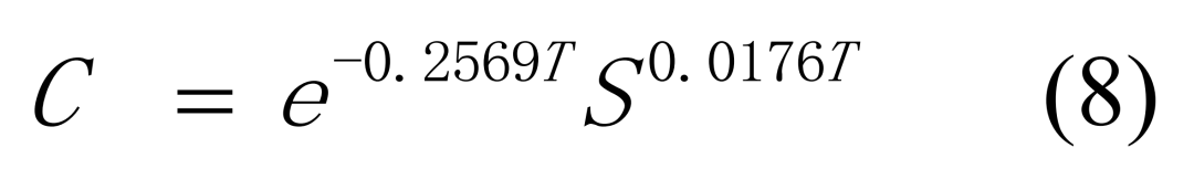 从图中还可以看出:预腐蚀疲劳寿命影响系数C是预腐蚀时间T和应力水平S的函数,且具有幂函数关系。令预腐蚀疲劳寿命影响系数C是预腐蚀时间T和应力水平的函数,且具有幂函数关系。