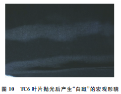 对抛光后的TC6叶片进行显微硬度测试,发现“白斑”区域的显微硬度为313HV,周围正常区域的显微硬度为347HV,“白斑”区域的显微硬度低于周围正常区域。钛合金导热性差,故钛合金叶片在抛光时,如果操作不当,很容易造成零件表面产生的热量不能及时传导,使零件小范围内温度升高而形成抛光烧伤,较轻微的仅有表面烧伤,严重时会形成穿透性烧伤。