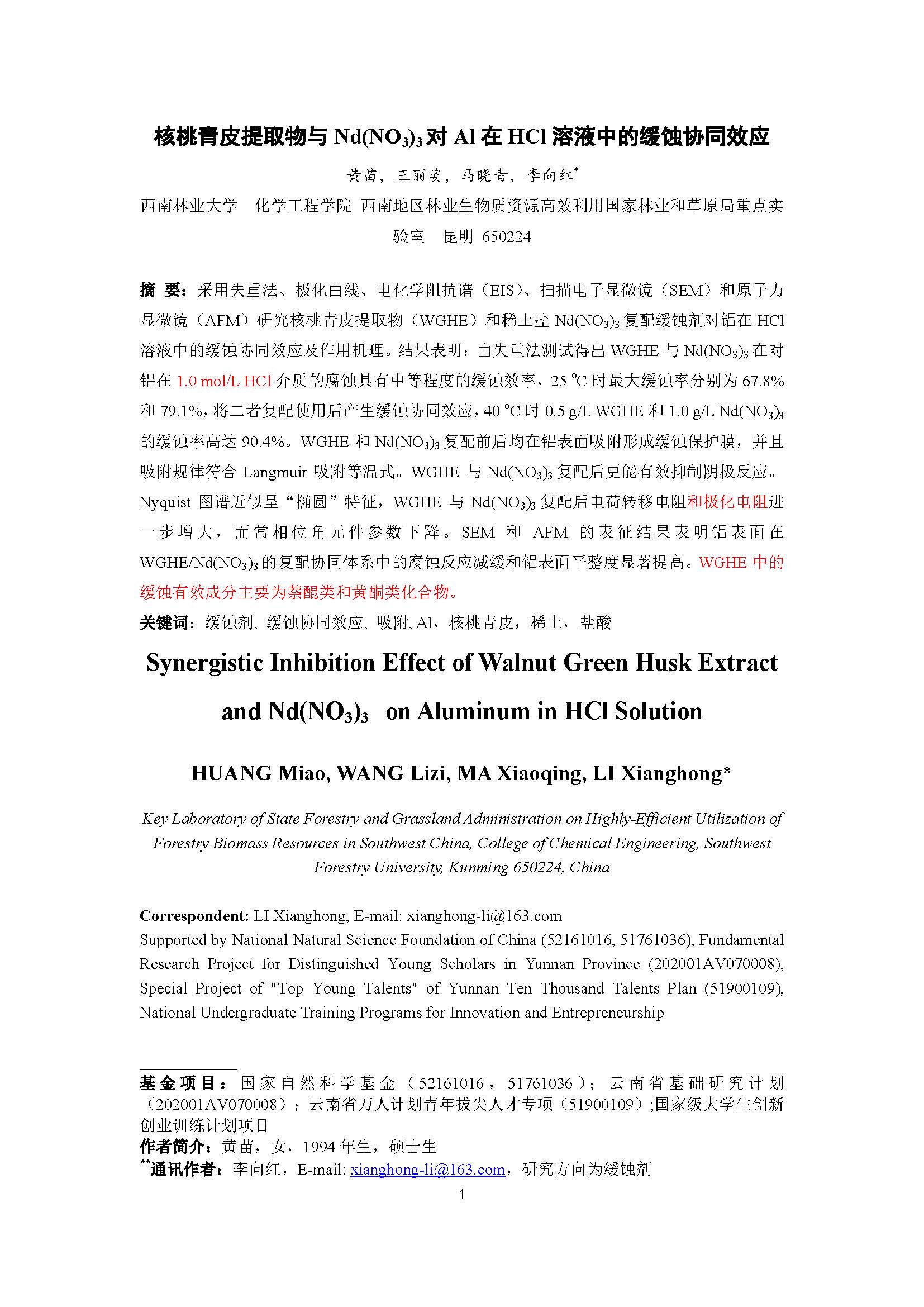 核桃青皮提取物与Nd(NO3)3对铝在HCl溶液中的缓蚀协同效应