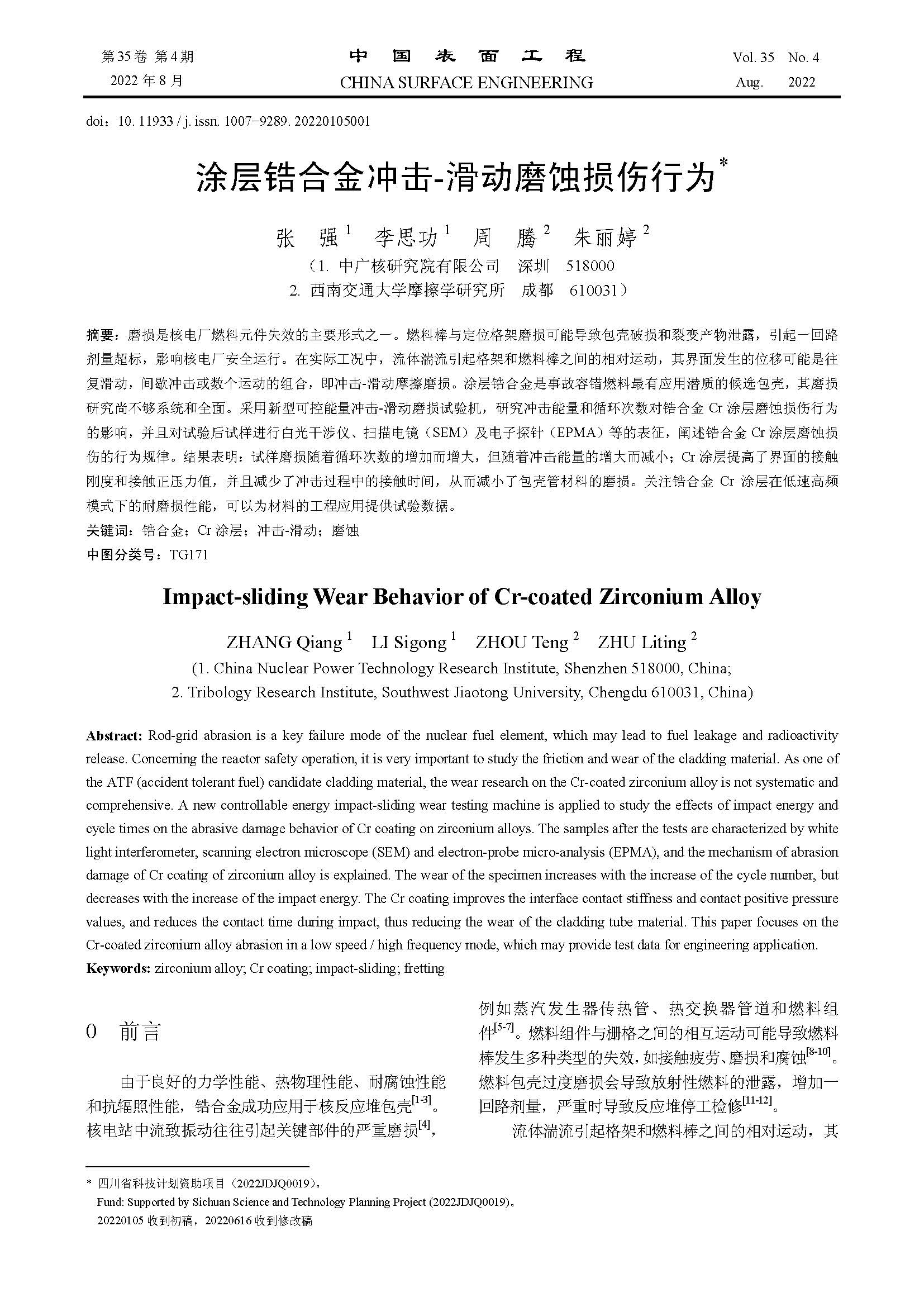 核反应堆中锆合金包壳及其表面涂层的微动磨损行为研究