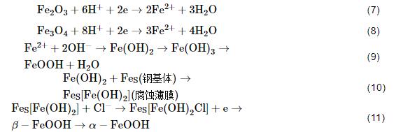 污水中的SO42-与Fe2+结合,FeSO4水解形成氧化物和游离的硫酸,硫酸又加速钢的腐蚀,新得到的FeSO4再次水解生成新的酸[20],如反应式 (12~13)。