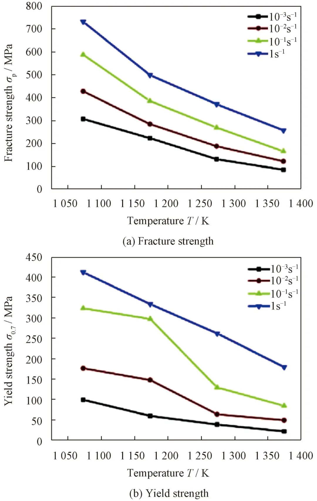 Fig.4 Changes of fracture strength and yield strength of AlCoCrFeNi with deformation temperature at different strain rates [49]