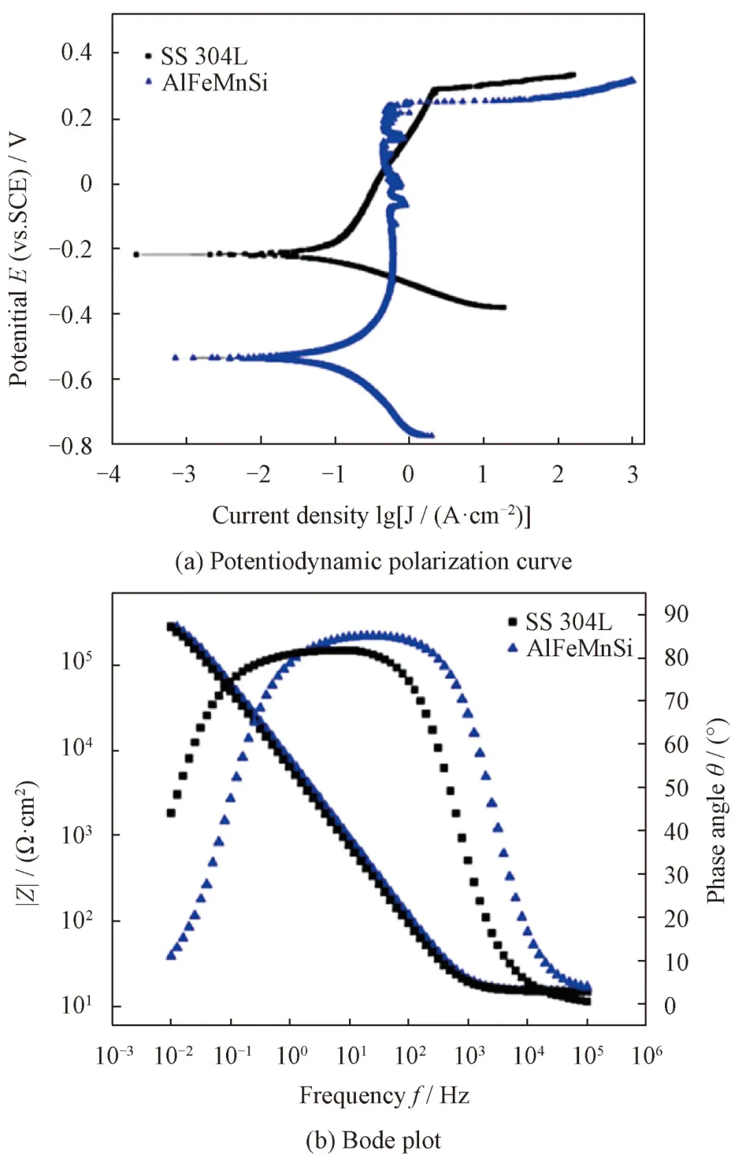 Fig.5 Potentiodynamic polarization curves of AlFeMnSi and 304stainless steel collected using a potential scanning rate of 0.167mV/s, and Bode plot of AlFeMnSi and 304stainless steel in 0.6mol/L NaCl solution [53]