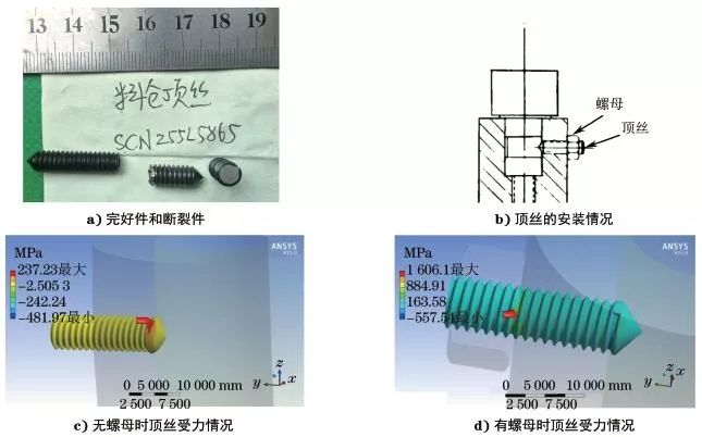 图2 断裂顶丝宏观形貌及有限元模拟结果