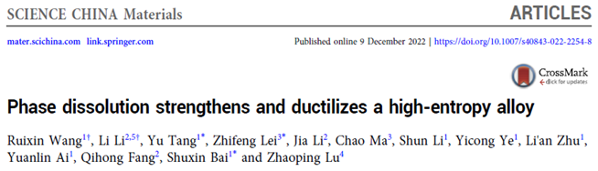 Wang R., Li L., Tang Y., et al. Phase dissolution strengthens and ductilizes a high-entropy alloy. Sci. China Mater. (2022).