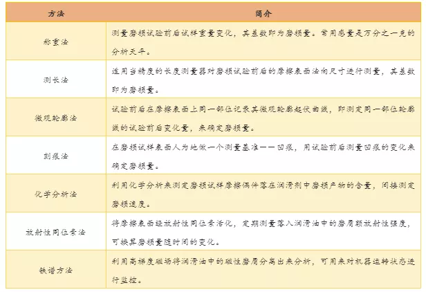 磨损时零件表面的损坏是材料表面单个微观体积损坏的总和。目前对磨损评定方法还没有统一的标准。这里主要介绍三种方法:磨损量、耐磨性和磨损比。