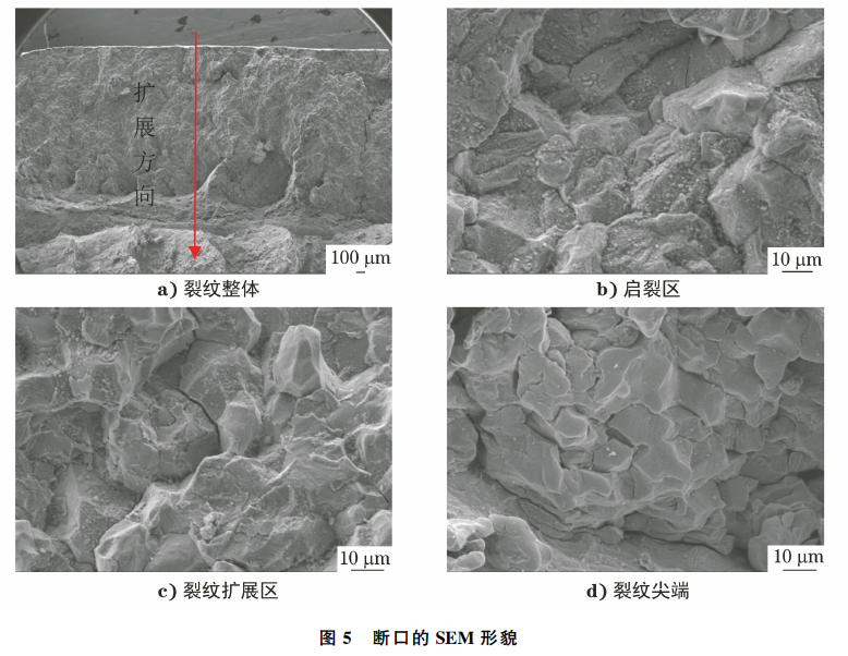 由图5可知:换热管启裂区、裂纹扩展区及裂纹尖端均呈沿晶开裂特征,断面呈块状,并可见二次裂纹,晶面附着有颗粒状垢物。