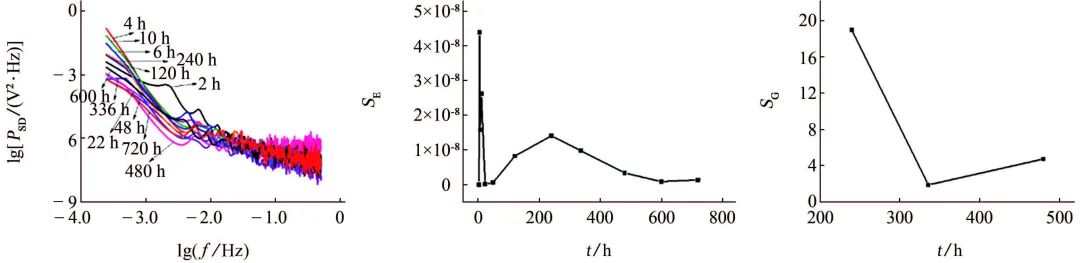 由于MEM法在时间域上具有更高的分辨率,将电位-时间曲线数据经MEM法变换后,得到功谱率密度(PSD)曲线,通过拟合计算出PSD的三个特征参数:白噪声水平W、高频端线性斜率k和截止频率fc,再根据下式计算出SE和SG随时间的变化曲线。SE反映了快步骤的信息,如腐蚀过程的点蚀速率。SG主要反映了慢步骤的信息,如粒子的迁移、扩散以及晶核生长等。
