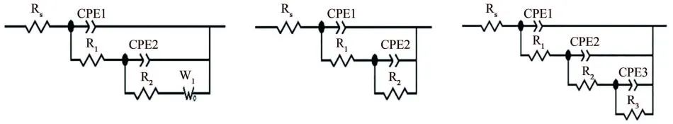 在静态海水中,腐蚀初期铝青铜表面会迅速形成一层CuO2膜层,阻碍腐蚀进程。随着腐蚀的进行,CuO2膜层逐渐变厚,氧在膜层间的扩散越来越困难,当腐蚀过程达到氧的极限扩散浓度后,铝青铜的腐蚀由氧扩散控制。因此,在腐蚀初期铝青铜的电化学阻抗谱存在两个时间常数,并伴随扩散过程,可采用如图3a所示的等效电路图进行拟合。