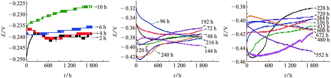 随着腐蚀时间的延长,电位逐渐负移,这可能是在铝青铜表面疏松的腐蚀产物大量脱落引起的。