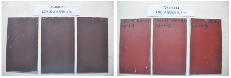 与浅海环境相比,装备涂层在深海环境中比表层海水环境中增加了高压海水渗透与海水压力交变两种腐蚀因素,导致涂层在深海环境中的破坏速度加快,影响涂层防护性能,大大缩短涂层防护寿命。 深海装备防腐涂料服役环境 海洋环境下,在金属表面涂装有机涂层是最有效的防腐方法之一。有机涂层紧贴在基材表面,形成一层阻隔层,可以阻隔氧气,并减缓水分子和其他腐蚀性离子的渗透,为基材提供有效的防护。 深海环境下,海水中的溶解氧含量、海水流速、温度、盐度、pH值、海水静水压力、生物条件等因素随着海水深度增加而变化,如表1所示。在深海环境中,装备用防腐涂料的防护性能主要受海水静水压力、温度、水渗透、氧及侵蚀性离子的渗透、局部阴极保护异常电位以及杂散电流的影响。其中,深海环境区别于浅海环境的最大特点是深海静水压力与高压下水及侵蚀性离子的渗透。 表1 美国太平洋海区深海测试364~763天的腐蚀数据 氧是海洋材料电化学腐蚀的去极化剂,海洋中溶解氧的含量对金属材料的腐蚀至关重要。海水中溶解氧含量随海洋深度的增加先低后高,以表层海水中溶解氧含量最高。研究表明,当介质中的氧含量越高,基材/有机涂层边界处阴极与阳极的电位差越大,促进金属基材的阳极溶解速度,破坏了基材与有机涂层之间的结合,使基材表面的涂层发生脱落。 随着海水深度增加,海水温度逐渐降低,当水深在2000米左右时,海水温度约为2 ℃。温度对有机涂层的保护可产生显著的影响,由于有机涂层的热膨胀系数和金属基材的热膨胀系数不同,温度变化时,涂层与基材之间界面处的形变程度不同,界面压力的变化导致涂层微孔和涂层缺陷的膨胀,从而加剧水和腐蚀性介质向基体界面处的持续渗透,降低涂层与基材的附着力,缩短涂层的使用寿命。 阴极保护是指在受保护的基材外表面施加一个外加电流,使受保护的结构变成阴极,抑制腐蚀电化学的过程,从而抑制腐蚀。目前,海洋材料多采用将有机涂层与阴极保护相结合的方法对基材实施有效的腐蚀防护。随着涂层服役时效的增加,涂层内部将不断产生新的缺陷,降低涂层与基材的附着力,使涂层逐渐失去防护效果,此时阴极保护可对基材提供主要的防护作用。但阴极保护在对基材进行防护的同时,伴随着阴极电流的增加,这会导致溶液中的OH-浓度增加,使涂层/基材界面处的碱度增大,促进涂层的开裂与剥落。 深海区别于浅海最大的特点就是海水静水压力的变化。海水深度每增加100米,压强就增加约1 MPa。海水压力的变化会对海水中氢元素、氧元素、Cl-渗透以及海水的电离平衡产生作用。近年来,国内外学者就深海压力对有机涂层防护效果与防护性能进行了大量研究。 深海装备用防腐涂料应用现状 针对深海装备用防腐涂料,国外发达国家海军开展了一些研究工作。2003年,美国海上系统司令部批准INTERGARD 143高固体分环氧涂料用于深海装备的维修防护涂料,提高了深海装备的防腐性能、安全性和可靠性。俄罗斯海军使用E-51液态环氧树脂为基料,酰氨基胺类为固化剂合成的厚浆型涂料,该涂料体积固体分高达98%,涂层干膜厚度>1 mm,涂层柔韧性好,耐盐雾性能优良。英国海军的S级、特拉法尔加级与先锋级深海装备透水部位采用高固体分环氧涂料(82%),涂层干膜厚度在300 µm左右。德制209级深海装备采用高固体分环氧涂料(81%),涂层干膜厚度达550 µm,设计使用寿命10年。 目前国内针对深海装备防腐涂料的实际应用较少,研究主要集中于实验室内分析深海防腐涂料的失效机理与失效性能评价。中船重工七二五研究所工作人员针对两种防腐涂层(725-H06-51和725-H44-61),在南海800米和1200米深的水域开展了3年的深海挂片试验,回收后的试验样板如图2所示。样板在实海中浸泡3年后,涂层表面完整,漆膜无起泡、无裂纹、无脱落。 通过各国海军深海装备上防腐涂料的应用可以发现,环氧类涂料是当前应用范围最广的海洋用重防腐涂料。深海装备防腐涂料除了具有一般防腐涂料的性能外,还应具有以下特点: (1) 高固体分。高固体分涂料不仅可以增加漆膜厚度,还具有优异的耐水性和耐化学溶剂性,使涂层能够阻挡水和侵蚀性离子的渗透,实现良好的耐蚀性和长效使用寿命。 (2) 涂层厚膜化。涂层厚膜化对涂层服役寿命至关重要。研究表明,对于单侧浸泡的渗透扩散过程,液体介质渗透到涂层/金属基体界面的时间T=L2/6D,其中L为涂层厚度,D为扩散系数,表明介质渗透到基体的时间与涂层厚度平方成正比。较厚的涂层可以为涂料的长期防护提供保障。 深海环境中涂料的失效行为与机理 导致涂层失效的因素有很多,涂层本身的失效形式也是多样的。例如在涂层制备过程中,金属基体表面清洗不彻底,或由于外部环境污染导致金属表面油污污染,使涂层局部与金属基体的结合力较弱,加速溶液渗透进入涂层/金属基体界面,诱发涂层的鼓泡与剥离。除此之外,当涂层表面被撞击、划伤等,会在涂层表面留下宏观缺陷,供外部腐蚀介质渗透进入,导致涂层后续的失效。 针对不同学者关于深海环境下涂层的失效分析,结果表明,静水压力增大促进水与腐蚀性介质在涂层内部的扩散是影响涂层失效的主要原因。由于涂层内存在孔隙,水分子/腐蚀性介质通过孔隙进入到涂层内部。在深海设备下潜过程中,静水压力增大导致涂层的原始孔隙变