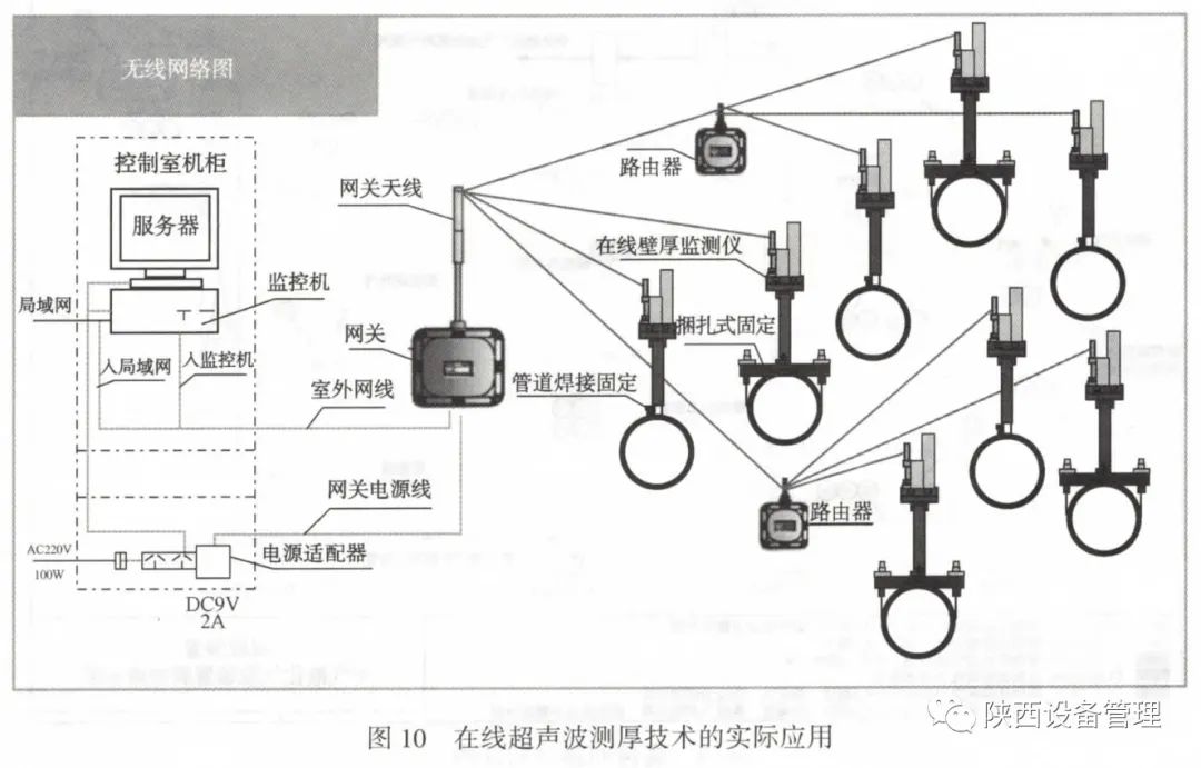 如图10所示,可以实现不开孔、卡箍式安装或管道焊接螺柱安装;测厚数据采用无线网络模式传输,即利用网关和路由器,将数据传送到远程数据平台;实现连续测厚监测。