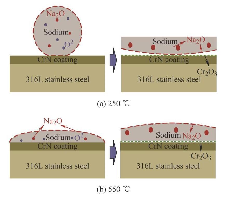 作为典型的过渡金属氮化物涂层,氮化铬涂层具有良好的高温抗氧化性、耐磨性能、耐腐蚀性和抗黏着性,广泛应用于切削工具表面和发动机刷丝等高温零件[89-90],被认为是最有前途的硬质润滑涂层候选材料之一[91-93]。蒋钊等[94]通过第一性原理的研究表明,−6.4~1.8eV范围内Cr原子3d轨道和N原子2p轨道间的相互作用使得CrN涂层具有优异的结构稳定性。CHEN等[95]研究了CrN涂层在液态金属钠中的摩擦行为,如图5所示。在250℃的温度下,液钠环境对CrN涂层的摩擦磨损性能具有积极影响。这主要是由于液态钠中的氧化物能够与CrN发生摩擦化学反应而生成润滑性氧化膜,使CrN涂层的摩擦因数降低至0.2。然而,在550℃ 的温度下,液钠与CrN涂层完全润湿,减少了摩擦过程中氧化膜的形成,导致相对高的摩擦因数和磨损率。添加金属润滑相Ag能够改善CrN涂层的力学性能以及摩擦学性能[96-98]。JURCI等[99]发现CrN中添加Ag不仅改善了涂层在基底的黏附性,同时在中温条件下具有优异的摩擦学性能。与纯CrN涂层相比,在400~500℃的环境下的CrN-Ag涂层摩擦因数降低了70%~75%,磨损率降低了3倍。PAPI等[100]在CrN/Ag薄膜表面设计了一层CrN扩散屏障层,并通过改变CrN表面层的厚度,调整柱状晶体的间隙使其越来越窄,由此增加了Ag转移至薄膜表面必不可少的扩散激活能,从而有效控制了Ag的扩散速率。然而,MexNy 扩散屏障层生长过程中易于形成粗大的柱状晶结构,摩擦过程时常发生晶界疲劳,同时外部环境氧也易通过粗大的柱状晶间隙渗透至薄膜内部导致过渡氧化。因此,如何优化MexNy 陶瓷扩散屏障层成分及结构,从而改善薄膜的高温力学和摩擦学性能仍,是MexNy/Ag薄膜需解决的关键技术问题。