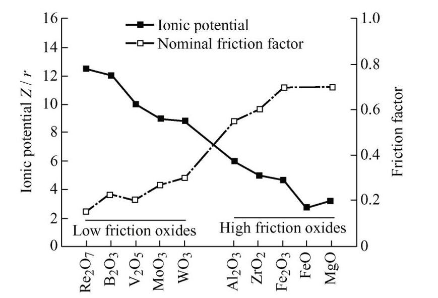 在高温大气环境下,金属摩擦副运动表面会发生摩擦化学反应生成各类氧化物,随后氧化物将参与摩擦磨损过程进而影响摩擦因数和磨损形式。某些金属或非金属氧化物(Re、Ti、Mo、Zn、V、W、 B氧化物等)在摩擦过程中易发生变形或剪切而具有较低摩擦因数和磨损率[47-49]。图2所示为几种氧化物摩擦因数随温度变化的趋势图。ERDEMIR等[50] 指出金属氧化物的摩擦学性能与离子势(阳离子电荷/阳离子半径)的高低有关。如图3所示,V2O5、 B2O3、Re2O7 等离子势越高的氧化物其摩擦因数越小,摩擦因数保持在0.13~0.25,而Al2O3、ZrO2、 FeO等离子势较低的氧化物,摩擦因数大于0.5。