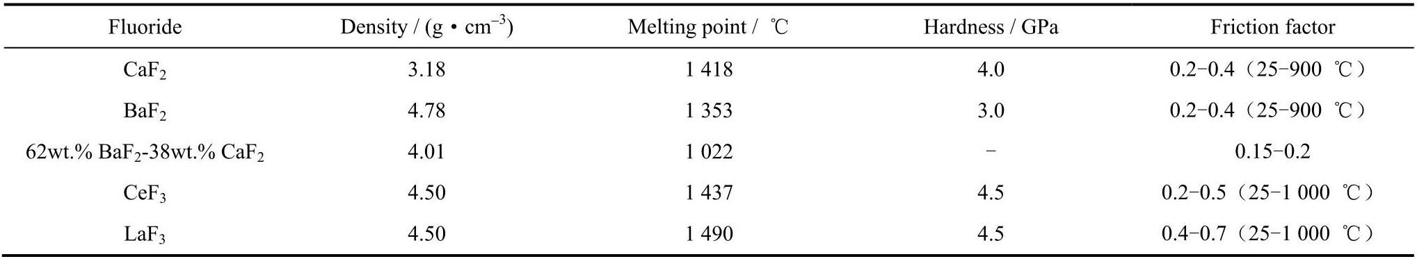 碱土金属/稀土金属的氟化物如CaF2、BaF2、 LiF、NaF、CeF3、LaF3 等均具有较高的熔点和良好的化学稳定性,在高温下软化从而表现出良好的润滑性能[28]。因此,碱土金属/稀土金属氟化物是一类重要的高温固体润滑材料。表1为一系列碱土金属/稀土金属氟化物固体润滑剂的物理性质和摩擦学性能[28-30]。其中CaF2 和BaF2 均属立方晶系,由于温度升高使其从脆性材料转变为塑性材料而具有润滑作用,在900℃条件下不会发生氧化失效。共晶碱土金属氟化物62wt.%BaF2-38wt.%CaF2在航天飞机及氢介质的斯特林发动机中的成功应用得到了广泛关注[29]。然而,由于碱土金属/稀土金属氟化物在低温和中温环境下脆性较强,摩擦过程中会发生磨粒磨损,所以碱土金属/稀土金属氟化物通常充当润滑添加剂。