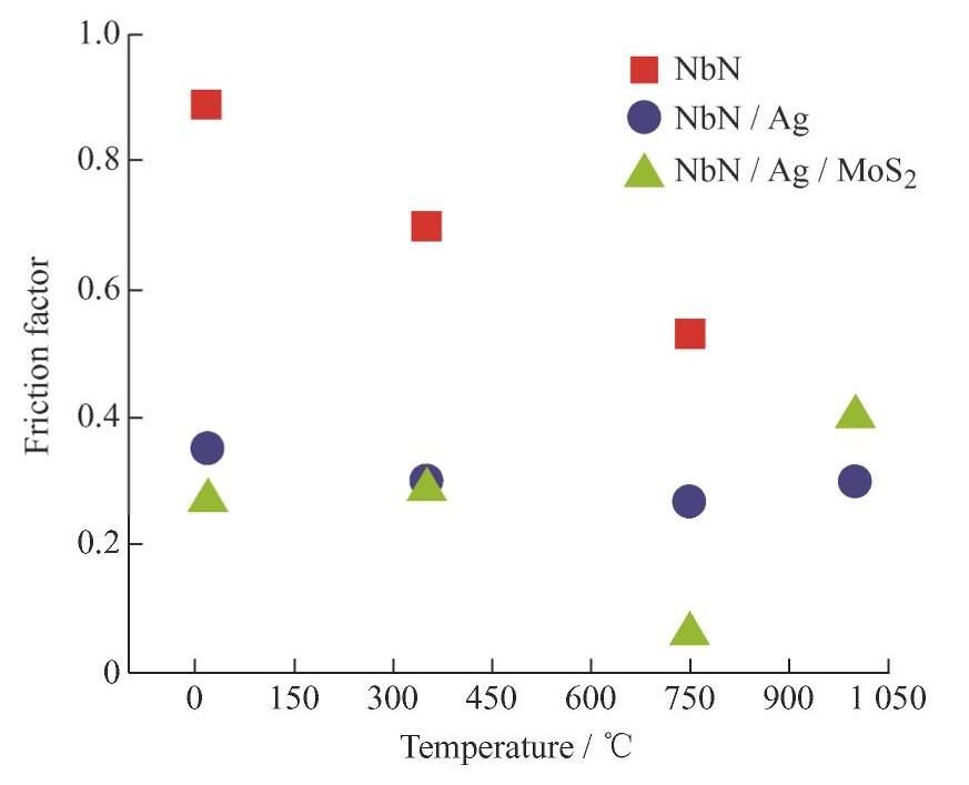 氮化物涂层,包括VN、CrN、TiN、MoN等,具有高的硬度及优良的高温耐磨性能,能够有效提高摩擦副的磨损特性,延长零件的使用寿命。相关研究发现,高温或摩擦过程中,氮化物涂层表面原位形成的易剪切金属氧化物是实现高温低摩擦的主要润滑相。由于这些氧化物仅在特定的温度下具有良好的润滑性,因此不同硬质氮化物涂层具有不同的摩擦学性能,限制了纯氮化物涂层在宽温度范围内的应用。为实现宽温域范围内的低摩擦因数,具有较低摩擦因数的二硫化钼、软金属和碳等作为润滑相制备复合氮化物涂层[69-70]。