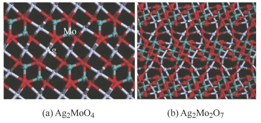 除了二元氧化物,研究者还发现了具有润滑作用的三元及多元氧化物盐类。无论是摩擦氧化过程中原位形成,还是作为固体涂层制备出来的复杂盐类氧化物,都有可能作为有效的固体低摩擦涂层。STONE等[59]研究了Ag-Mo、Cu-Mo、 Pb-Mo的钼酸盐类在25~700℃范围内的摩擦学性能,发现钼酸盐可以作为潜在的高温润滑剂应用。其中Ag2MoO4 结构中Ag2O和MoO3 的混合层分离可以呈现层状结构,在摩擦过程中相对较弱的Ag-O键易断裂形成富Ag润滑涂层,使其呈现良好的润滑效果。图4显示了Ag2MoO4 和Ag2MO2O7 的晶体结构[60]。然而,ERDEMIR等研究表明,由于Ag2O和MoO3 之间的离子电势差较大,这种混合氧化物在高温条件下具有较大的摩擦因数[50]。因此,Ag2MoO4 良好的摩擦学性能可能是其晶体的化学性质而非层状微观结构所致。GULBIŃSKI等[61]利用PVD沉积出单相Ag2MoO4 涂层,结果显示涂层摩擦因数随温度升高而降低,从100℃的0.35降到500℃的0.25,当测试温度超过Ag2MoO4 的熔点(574℃)达到600℃时摩擦因数略有升高。研究者们还发现钽酸盐[59]、钛酸盐[62]、钨酸盐、铼酸盐等[47, 63-64] 都可在高温环境中表现出良好的摩擦学性能。研究表明氧化物之间的离子电势差越高 ( 例如PbO-MoO3 [65], PbO-WO3 [66], Ag2O-MoO3 [61], CuO-ZnO[67]),复合氧化物更稳定,润滑性能越好。Pb-Cr-O系统在高温环境下可以反应生成PbxCryOz,生成的铬酸盐主要有Pb5CrO8 和Pb2CrO5 等晶体,且这种含铅的三元氧化物可以为PbO基涂层在高温环境带来更好的润滑性能。WU等[68]研究了不同原子比例的Pb-Cr-O涂层在高温环境中的摩擦学性能,研究发现随着Cr含量的增加,Pb-Cr-O薄膜逐渐转变为非晶态结构,其硬度也随之增加,其中Pb35Cr2O63 涂层在较宽温度范围内达到了润滑与耐磨的平衡。同时发现,将无Cr的Pb33O67 涂层沉积在718合金基体上,高温摩擦后涂层表面依然形成了Pb35Cr2O6 和PbO的混合润滑相,这是因为摩擦过程中718合金基体的Cr元素在热驱动下扩散进涂层中,实现了低摩擦性能。氧化物CrO3 在中低温下具有出色的润滑性能,在较高的温度下氧化形成的具有刚玉结构的Cr2O3 具有很高的耐磨性和热稳定性,可以作为增强相提高PbO涂层的力学性能;另一方面氧化铬与氧化铅的离子势差较大,在高温环境中易于形成三元含氧酸盐,从而提供了高温环境下的低摩擦性能。