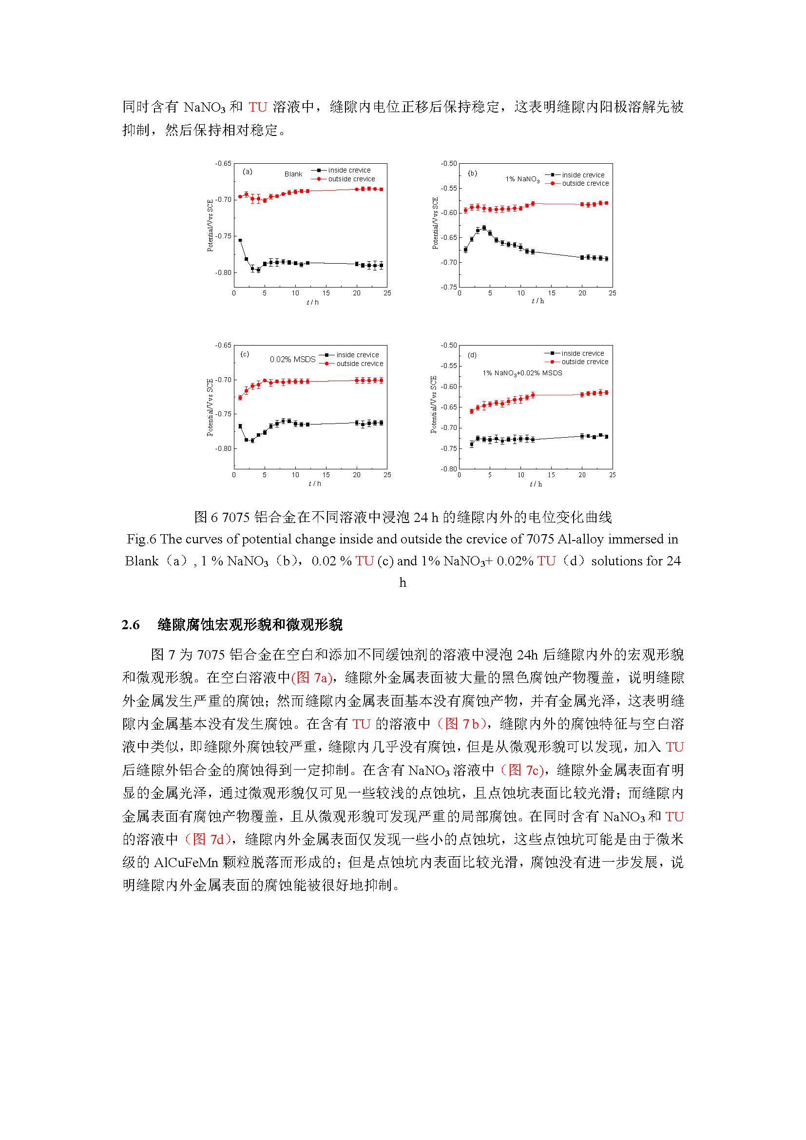 酸性氯化钠溶液中硝酸钠和硫脲对 7075 铝合金缝隙腐蚀的协同缓蚀作用
