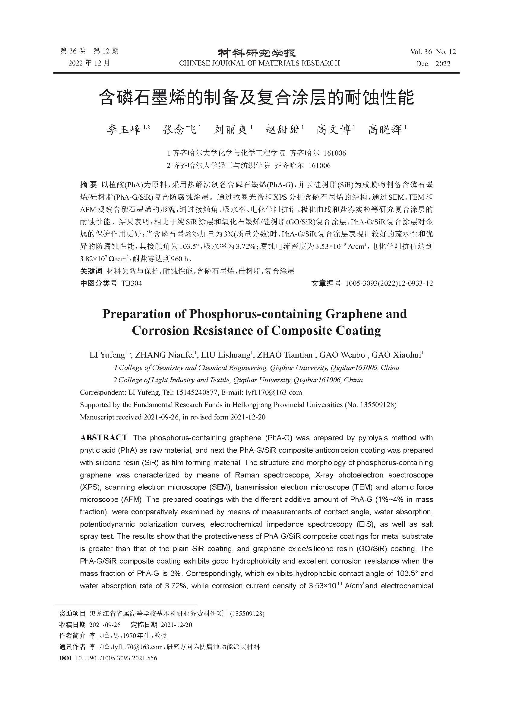 含磷石墨烯的制备及复合涂层的耐蚀性能