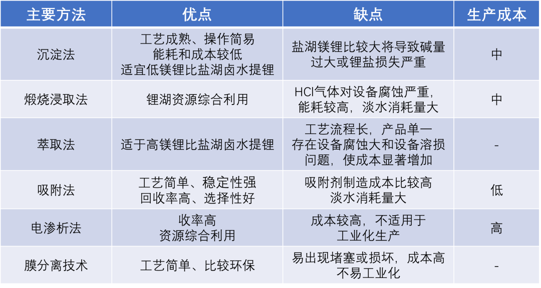 盐湖资源中主要成分是氯、钠、钾、硫、硼、镁、锂等,微量锂与大量碱金属、碱土金属共存,这些元素均是以液态形式存在,且大部分与锂具有相似相溶的性质,易与锂伴生出现。所以盐湖卤水开发通常是对各有用成分进行分别制取,而不是单纯提锂。