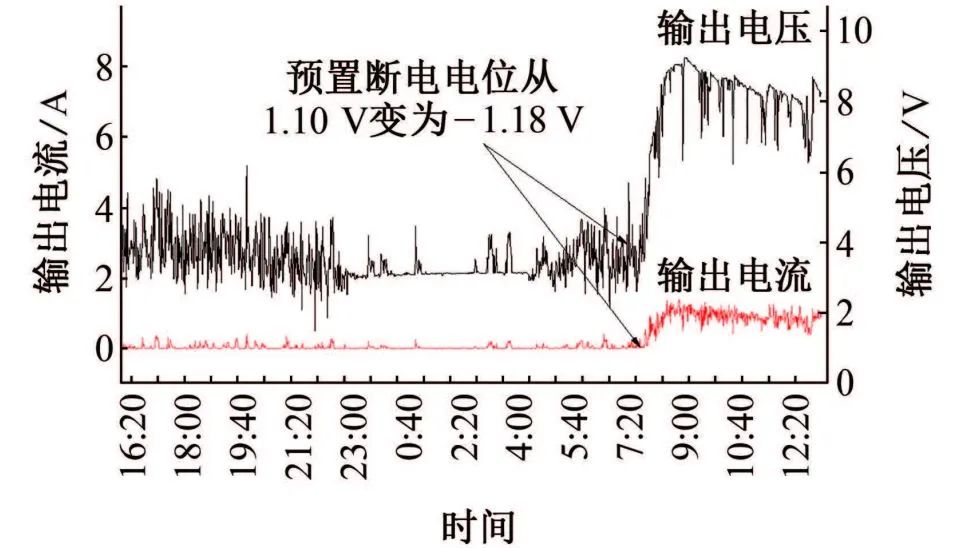 在测试周期内,新型恒电位仪的输出电流与输出电压变化详见图3,可见当预置断电电位为-1.10 V时,输出电流运行平稳,波动较小。由于管道与阳极地床之间土壤中存在杂散电流引起的IR降,输出电压受杂散电流干扰存在波动。当预置断电电位为-1.18 V时,输出电流及输出电压随之升高。相比传统恒电位仪的恒通电电位控制,新型恒电位仪在恒断电电位模式下,输出波动小,运行稳定,输出电流能根据预置断电电位进行调整。