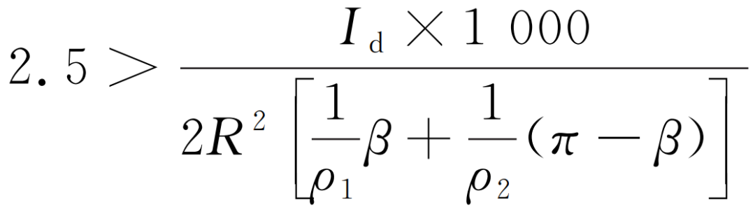 式中:Id为接地极入地电流;R为等效半球体半径,即安全距离;ρ1为海滩土壤电阻率;ρ2为大地土壤电阻率;β为土壤电阻率分界面与大堤夹角。