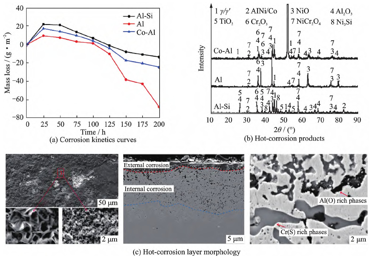 随着中国深海和远海战略的实施,大批先进舰艇下水,国产航母和大量舰载机也投入服役。相比陆地航机,舰载机航空发动机和燃气轮机热端部件在服役过程中的环境条件异常苛刻,除发动机/燃气轮机热端零部件所承受的高温、高压、高转速等载荷环境外,还承受海洋高盐雾、高湿度等腐蚀环境的影响。涡轮转子部件是舰载机航空发动机/燃气轮机中服役环境最恶劣的部件,不仅要在高温(600~1 300℃)条件下承受巨大的交变载荷,高温燃气和海洋大气中的热腐蚀也会加剧其损伤程度,涡轮转子部件因此成为故障率最高的工作部件之一。如图1所示,涡轮叶片因在燃气-海洋大气耦合环境中,在高温、高转速载荷下发生的热腐蚀-疲劳失效[1,2,3,4,5,6]。相比于单一机械载荷作用下的疲劳失效,航空发动机和燃气轮机热端部件热腐蚀-疲劳失效机理更为复杂,对热腐蚀-疲劳寿命预测难度更大。目前,国内外对航空发动机和燃气轮机热端部件热腐蚀-疲劳失效机理有了初步的认识,针对热端部件材料开展了热腐蚀机理研究、热腐蚀-疲劳失效机理研究以及热腐蚀-疲劳寿命预测,并取得了初步的成果。本文针对过去20年在航空发动机和燃机轮机热端部件热腐蚀-疲劳的研究进展进行梳理和总结归纳,以期促进燃气-海洋环境耦合作用下航空发动机和燃气轮机热端部件结构完整性评定方法的发展,提高航空发动机和燃气轮机的安全性和可靠性。Fig.1 Hot corrosion-fatigue failure of turbine blades镍基高温合金以其高温下优异的疲劳性能、蠕变性能和持久性能[7,8,9],成为航空发动机与燃气轮机涡轮叶片、涡轮盘等热端部件的主要材料[10,11,12]。同时,为了降低涡轮叶片表面温度和提高其抗氧化/腐蚀性能,在涡轮叶片表面通常喷涂有金属涂层或热障涂层(Thermal barrier coating,TBC)[13,14]。发动机在服役过程中,燃料中的杂质S在燃烧时会产生SO2、SO3等硫化物,与海洋大气环境中NaCl反应后会在合金表面沉积一层Na2SO4熔盐膜,形成的硫酸盐等沉积物导致涂层、高温合金发生热腐蚀,最终导致发动机热端部件过早失效[15,16]。高温合金热腐蚀是指沉积于合金表面的硫酸盐等沉积物破坏表面氧化物而加速合金腐蚀的行为[17]。对于高温合金来说,热腐蚀造成的破坏要比单纯高温氧化严重得多,其严重性受多因素影响,包括温度、沉积盐的种类和含量、环境条件、气体成分和合金成分等。根据环境温度高低,热腐蚀可分为低温热腐蚀和高温热腐蚀[18]。低温热腐蚀(560~815℃)一般在腐蚀盐的熔点之下发生,限制条件是需要较高分压的气相SO3,与涂层或者基体中的合金元素反应形成新的硫酸盐,这些硫酸盐与Na2SO4形成低熔点(熔点为540℃)的共晶化合物,使合金发生局部点蚀。高温热腐蚀(815~980℃)通常在腐蚀盐熔点以上温度发生,熔融态碱金属盐在基体表面沉积,然后逐渐破坏氧化层并消耗基体金属中的Cr,随着Cr元素耗尽,氧化速度加快,涂层或基体内部开始形成细微的孔洞,为腐蚀介质浸入提供通道。此时熔融状态的沉积盐使合金发生均匀腐蚀,高温热腐蚀的氧化层与合金基体交界处相对平整,界面下方有明显的硫化物形成。关于金属材料,尤其是铁基和镍基高温合金热腐蚀机理,Rapp[19]和Singh等[20]在21世纪初对其进行了总结。因此,本文主要针对近20年涡轮盘、涡轮叶片高温合金及涂层的热腐蚀机理进行综述。根据航空发动机和燃气轮机具体的服役工况和涡轮前温度,常用的涂层有渗铝涂层[21](如在叶片表面和内腔渗铝、渗铝硅涂层)、MCrAlY涂层[22]和热障涂层[23]等。高温合金叶片的典型热障涂层通常由金属黏结层和隔热陶瓷层组成,在高温合金叶片基体与高温燃气间提供隔热层和抗氧化层,从而保障叶片在较高的涡轮前温度下安全工作。金属黏结层可以提高基体合金与表面陶瓷层的结合强度,在高温服役过程中还可以形成一层致密的热生长氧化物(Thermally grown oxide,TGO)层,起到抗高温氧化的作用。目前常用的TBCs材料有:Y2O3稳定的ZrO2(YSZ、Y2O3的质量分数一般为7%~8%)、莫来石、Al2O3、YSZ+CeO2、La2Zr2O7、硅酸盐,其中YSZ是应用最广泛的TBCs材料[21,24,25]。由于涡轮叶片表面涂层在服役过程中承受温度高(>800℃),在燃气和海洋环境耦合工况下,涂层通常发生高温热腐蚀。取决于涂层类型、成分和微观结构,其热腐蚀产物也有所区别。对于金属涂层,其抗热腐蚀性能与涂层表面形成连续致密的Al2O3保护性氧化层密切相关。李玉春[26]采用埋盐法对K488合金及其表面渗铝和渗钴铝涂层的K488合金的热腐蚀行为进行研究,发现在900℃的25%NaC1+75%Na2SO4熔融盐中渗铝涂层表面生成了Al2O3和CoCr2O4的混合物,由于混合氧化物的存在使得耐腐蚀性提高,而渗钴铝涂层由于表面生成致密的Al2O3保护性氧化膜,表现出优异的抗热腐蚀性能。李艳明等[27]针对燃机叶片常用材料DSM11镍基高温合金,在其表面制备了Al-Si、Al和Co-Al这3种涂层,并通过在涂层表面涂盐(质量分数为5%NaC1+95%Na2SO4),研究了3种涂层在900℃的热腐蚀性能,如图2所示。研究结果表明,3种涂层的动力学曲线基本相似,均呈抛物线形,随腐蚀时间的延长,质量先增加后减少。产生上述质量变化的原因在于:在腐蚀实验前期(0~25 h),腐蚀产物与涂层结合紧密,腐蚀产物脱落较少;而在腐蚀的中、后期,表面腐蚀产物脱落,重新裸露出的内部涂层或基体进一步发生热腐蚀,质量减少。在900℃热腐蚀200 h后,Al-Si涂层和Co-Al涂