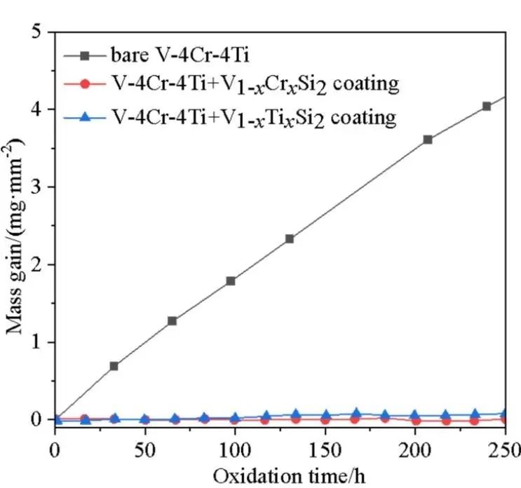 由于使用包埋渗透中间合金料VSi2+Si制备的VxSiy涂层容易出现鼓泡结构,Chaia等分别以CrSi2+Si和TiSi2+Si为包埋渗料进行抗氧化涂层的制备,获得了结构致密的V1-xCrxSi2和V1-xTixSi2涂层,但其表面仍会存在一些尺寸较小的鼓泡结构。650 ℃空气氧化实验结果表明,V1-xTixSi2涂层的氧化增重是VSi2的近1/4,是V1-xCrxSi2涂层增重的近1/2,即V1-xTixSi2涂层具有最优的抗氧化性能。